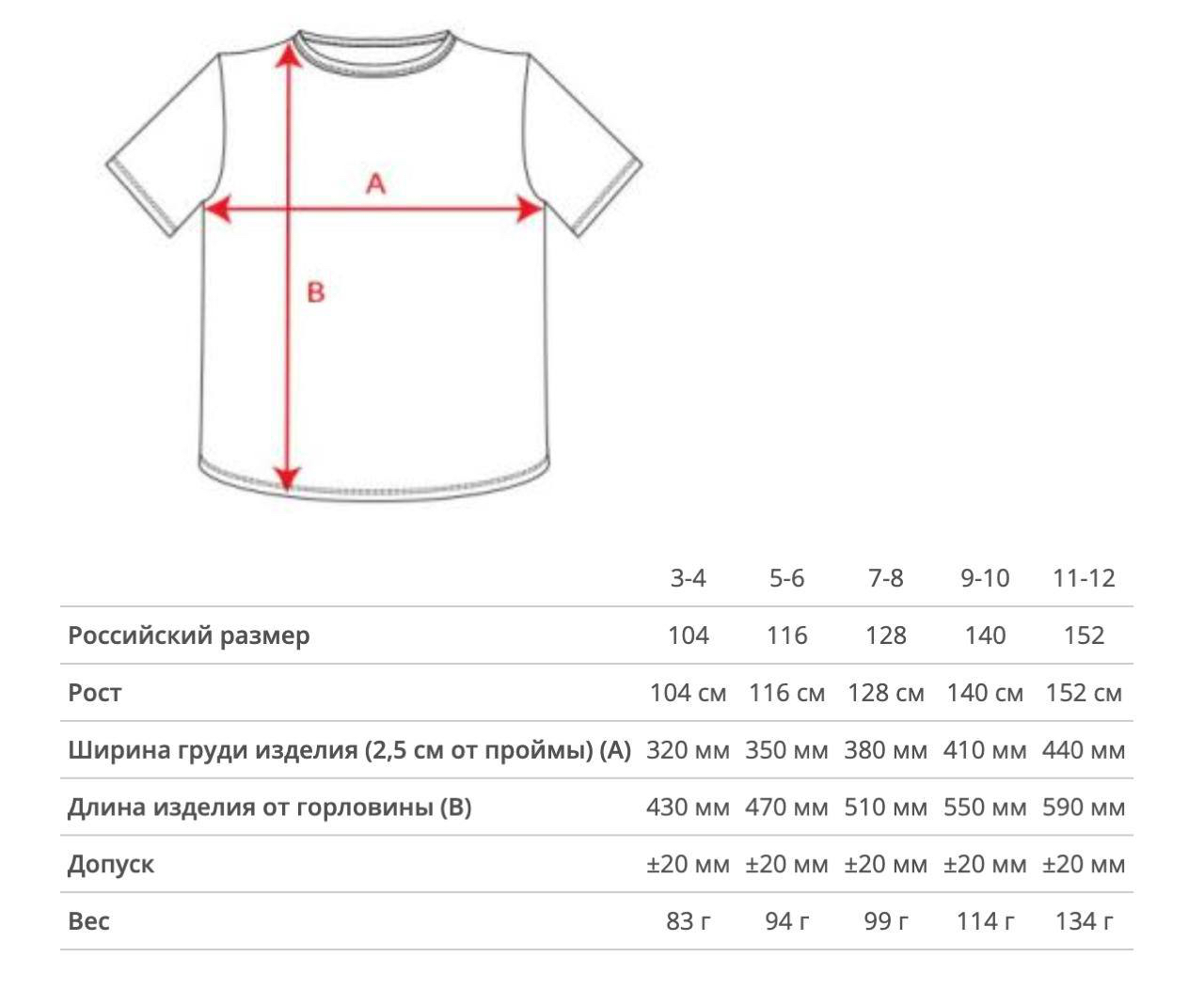 Таблица размеров: